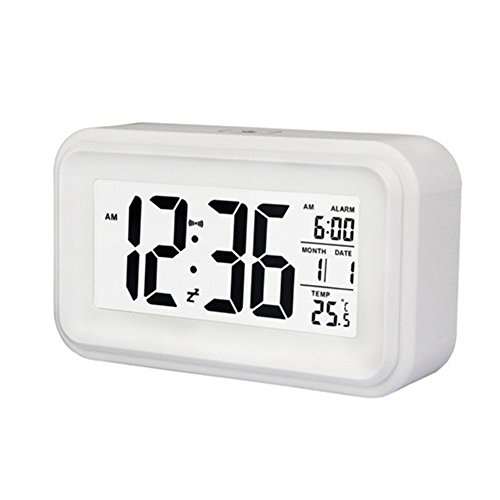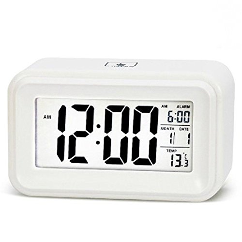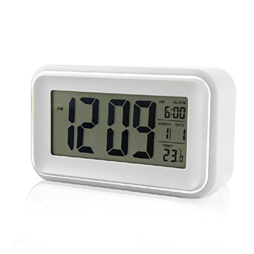 Sunnyseed Silent Digital 6" Alarm Clock with Date and Temperature Display, Repeating Snooze, Light-activated Sensor Light and Touch-activated Night light White