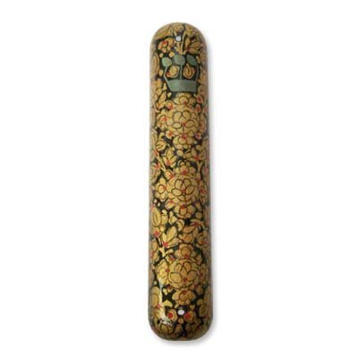 Paper Mache Mezuzah - Black with Gold and Red Dotted Leaves with Green 'Shin'