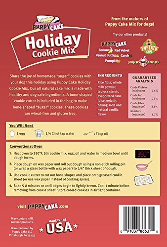 -. Binding : Misc. -. EAN : 0091037866370 -. Feature : Wheat, soy and corn free / All natural and wheat-free / Made in USA / Easy to make / Comes with a FREE bone shaped cookie cutter -. Label : Puppy Cake -. Manufacturer : Puppy Cake -. PackageQuantity : 1 -. ProductGroup : Pet Products -. ProductTypeName : PET_SUPPLIES -. Publisher : Puppy Cake -. Studio : Puppy Cake -. Title : Holiday Cookie Mix and Bone Shaped Cookie Cutter for Dogs 10 oz -. UPC : 091037866370