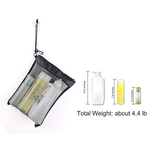 Features: Mesh shower bag helps to keep shower essentials well organized and within easy reach, good helper for dorms, bathrooms, gym, swimming pool, camping and travel, etc. Holds shampoo, conditioner, shower gel, face wash, soap, puff, shaving cream and other toiletries well. Carry anything you need with you, enjoy your shower. Long poly cord strap can be used to hook it around the shower handle or other object. Multifunctional snap hook can be used to hook onto shower curtain ring. Quick drying mesh bag is breathable, allows water to drain easily, no more moisture residue, mold and mildew resistant, clean and hygienic. Shower tote bag is made of nylon, anti-rust, washable, durable for long time using. Specifications: Color: black Weight: approx. 30 g Size: approx. 12 x 9 inches Material: nylon Package Included: 1 x mesh shower bag 1 x drawstring pouch Note: Drawstring pouch is not waterproof. 0