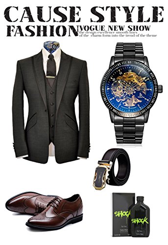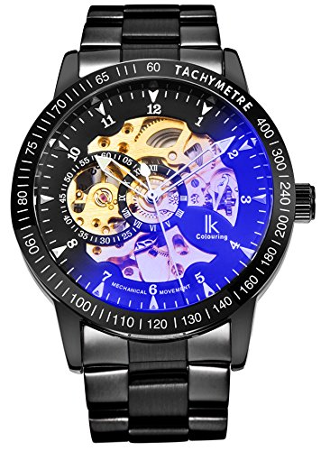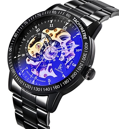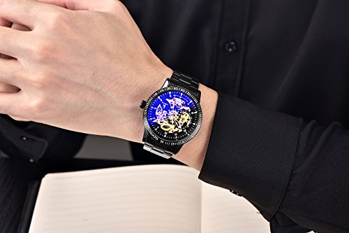 Product Features: Black Plated Metal Watch. Steam punk style skeleton dial and exhibition caseback. Protective mineral window lens. Stainless Steel Bracelet.Auto self wind movement with analog display,no need any battery. When the watch is worn on the wrist, the motion of the wearer's arm winds the mainspring of the watch.