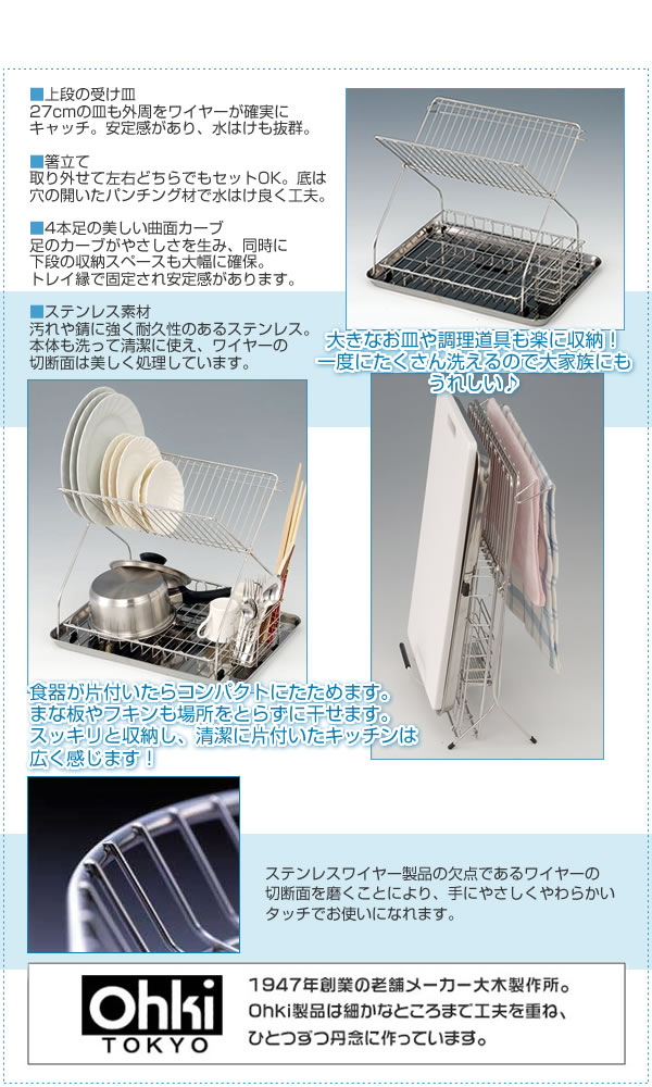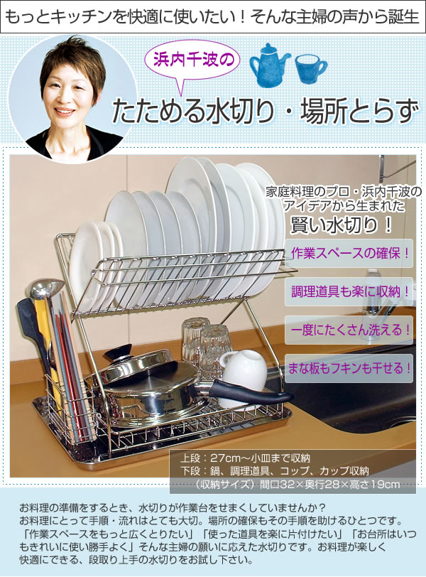 料理家・浜内千波のアイデアから誕生!もっとキッチンを快適に使いたい主婦のための賢い水切り☆使わない時はたためてスッキリ収納、広げればたっぷり洗える大容量!キッチンを広く使える場所とらずな水切りです。