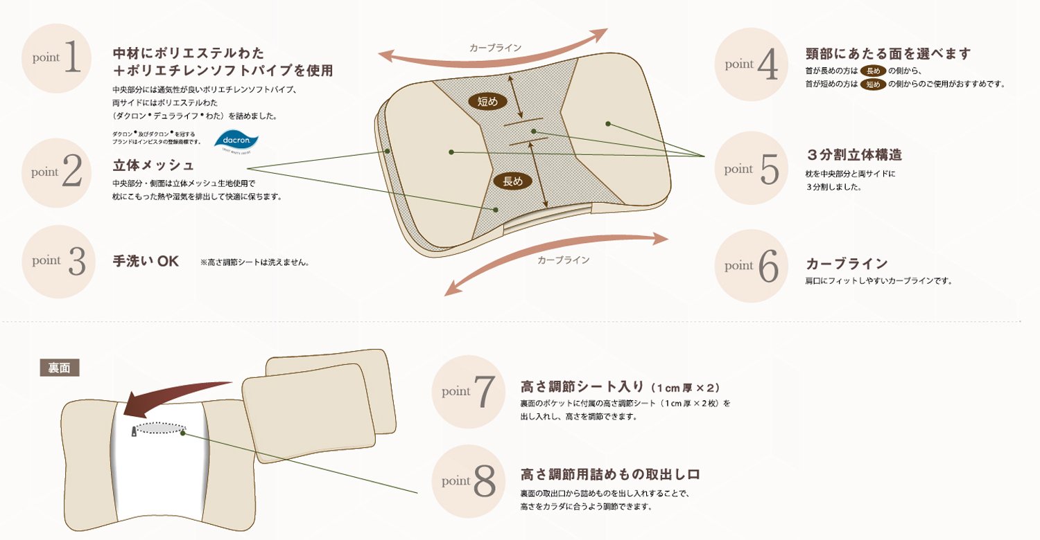 · By putting in and out a height adjustment sheet of about 1 cm thick of 2 pieces in the back pocket, you can easily adjust the height of the whole pillow.