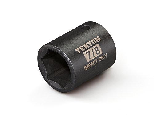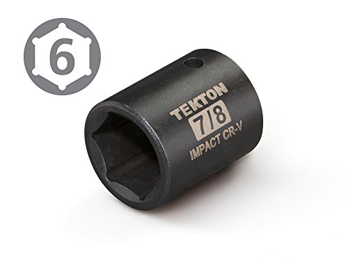 The TEKTON 1/2 in. Drive x 7/8 in. Shallow Impact Socket is engineered for use with impact drivers. It has a 6-point opening that snugly fits the hex shape of fastener heads, allowing it to apply maximum torque without slipping. To prevent round-off under stress, it grips the flat sides of fastener heads rather than the corners. Easy to read even in low light, the large, high-contrast size marking is permanently laser etched into the steel surface. The through-hole in the drive end locks onto the tang of impact wrenches or drivers so it won't fall off or stick on fastener heads. To protect against rust and corrosion, the black phosphate finish absorbs and holds oil, repelling moisture.