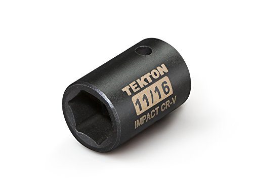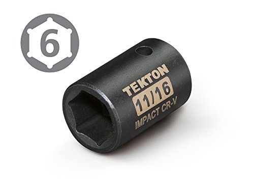 The TEKTON 1/2 in. Drive x 11/16 in. Shallow Impact Socket is engineered for use with impact drivers. It has a 6-point opening that snugly fits the hex shape of fastener heads, allowing it to apply maximum torque without slipping. To prevent round-off under stress, it grips the flat sides of fastener heads rather than the corners. Easy to read even in low light, the large, high-contrast size marking is permanently laser etched into the steel surface. The through-hole in the drive end locks onto the tang of impact wrenches or drivers so it won't fall off or stick on fastener heads. To protect against rust and corrosion, the black phosphate finish absorbs and holds oil, repelling moisture.