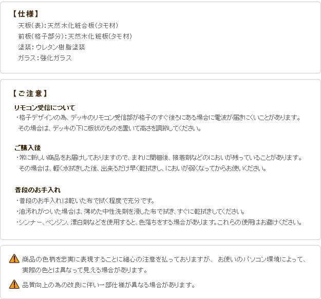 材質:天板(表)-天然木化粧合板(タモ)・ウレタン樹脂塗装、前板(格子部分)-天然木化粧板(タモ)・ウレタン樹脂塗装、ガラス-強化ガラス