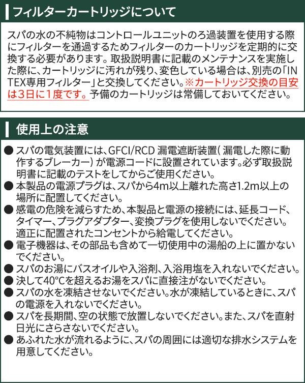 | セット内容 | スパ本体、コントロールユニット、専用カバー、取扱説明書、保証書(保証期間:購入後1年) |