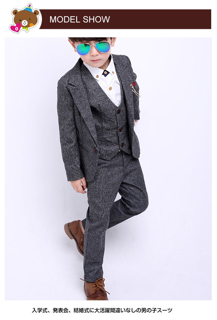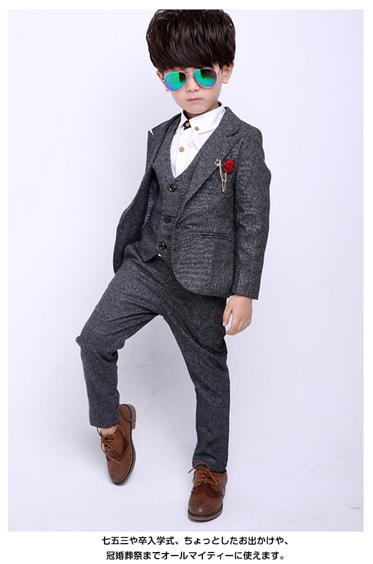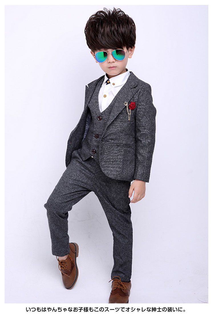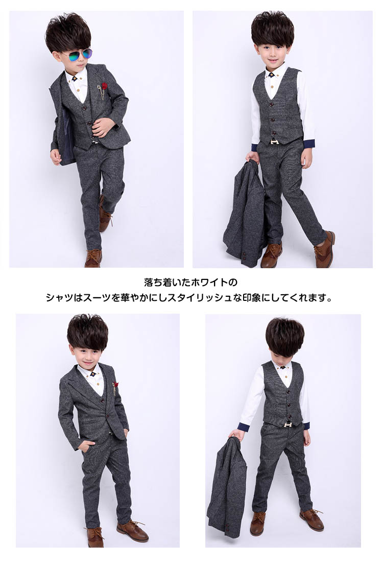 | 入学式、発表会、結婚式に大活躍間違いなしの男の子スーツ落ち着いたホワイトのシャツはスーツを華やかにしスタイリッシュな印象にしてくれます。いつもはやんちゃなお子様もこのスーツでオシャレな紳士の装いに。七五三や卒入学式、ちょっとしたお出かけや、冠婚葬祭までオールマイティーに使えます。 | |