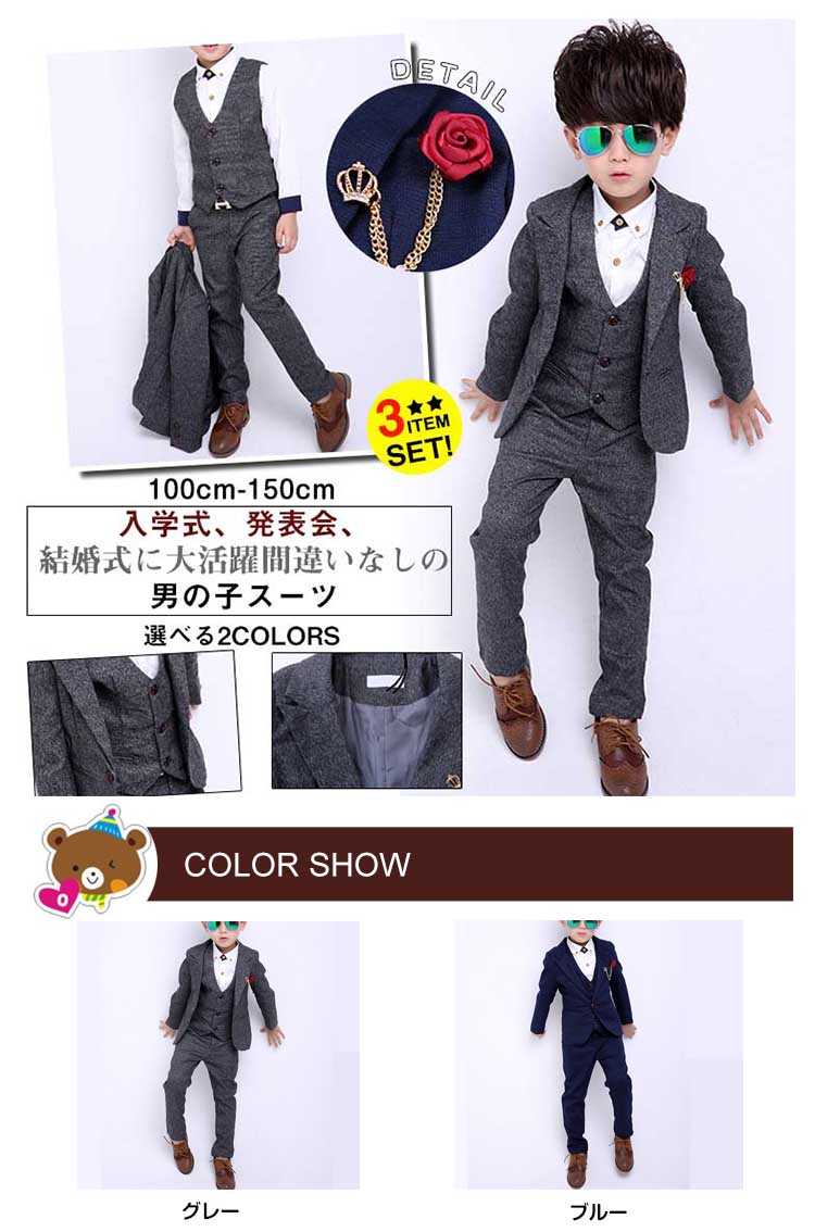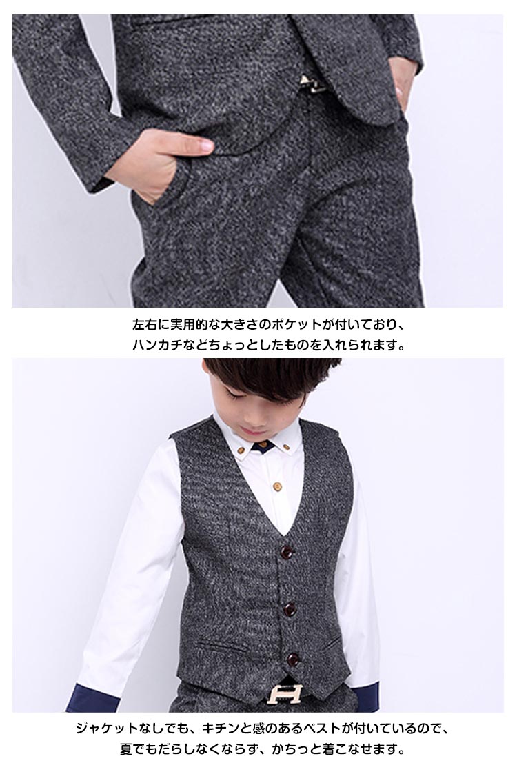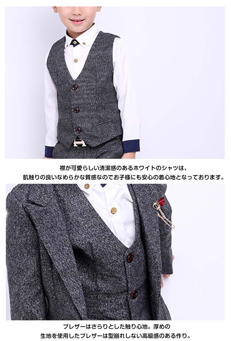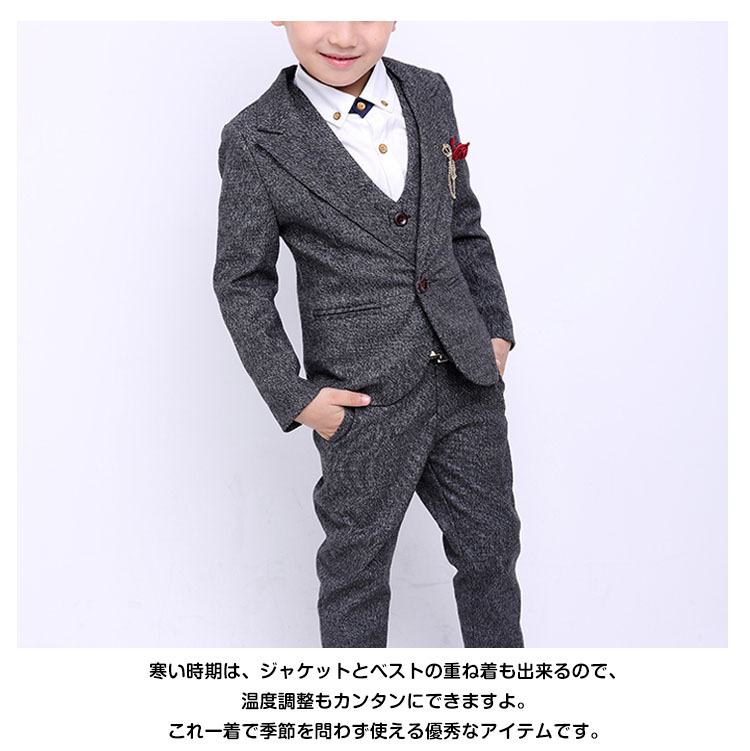 | 入学式、発表会、結婚式に大活躍間違いなしの男の子スーツ落ち着いたホワイトのシャツはスーツを華やかにしスタイリッシュな印象にしてくれます。いつもはやんちゃなお子様もこのスーツでオシャレな紳士の装いに。七五三や卒入学式、ちょっとしたお出かけや、冠婚葬祭までオールマイティーに使えます。 | |