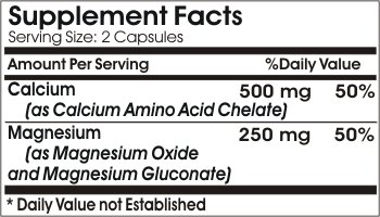 -. Feature : Chelated Calcium and Magnesium 500mg/250mg // 100 Capsules // Pure // by PureControl Supplements / The product does NOT contain: Preservatives, artificial coloring, artificial flavor, yeast, corn, milk or milk derivatives, lactose, salt, sodium, soy, sugar, gluten, starch or wheat. / Best Quality. / Made in USA / Pure and Natural. Other Ingredients: Gelatin, Rice Powder.