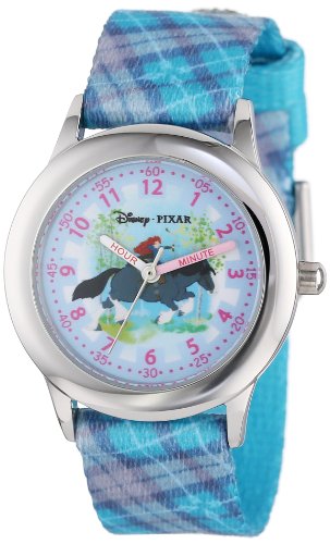 -. Binding : Watch -. Brand : Disney -. Color : Silver/Steel -. Department : girls -. EAN : 0843231062863 -. Feature : Round Time Teacher Stainless Steel Watch with Disney's Merida character on dial. / Meets or exceeds all US Govt requirements and regulations for Children's watches. / Recommended for Ages 3-7 years old. Includes a Time Teacher Punch Out clock for Parents to Teach their Children. / Accurate Japanese Quartz movement, scratch resistant mineral crystal, P.R.Inted Nylon strap / Water Resistant to 99 feet: withstands rain and splashes of water, but not showering or submersion. / 1 Year Limited Manufacturers Warranty -. Label : Disney -. Manufacturer : Disney -. Model : W000265 -. MPN : W000265 -. NumberOfItems : 1 -. PackageQuantity : 1 -. PartNumber : W000265 -. ProductGroup : Watch -. ProductTypeName : WATCH -. Publisher : Disney -. ReleaseDate : 2012-10-01 -. Studio : Disney -. Title : Disney Kids' W000265 Merida Stainless Steel Time Teacher P.R.Inted Strap Watch -. UPC : 843231062863