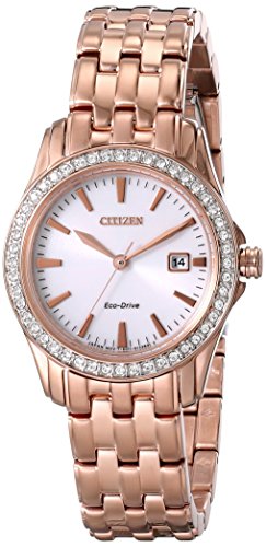 -. Binding : Watch -. Brand : Citizen -. Color : Rose Gold Tone Stainless Steel -. Department : womens -. EAN : 0013205107962 -. Feature : Eco-Drive is fueled by light so it never needs a battery / Pink gold tone stainless steel bracelet with silver tone dial / 3 Hand Basic / Mineral Crystal / Water resistant to 330 feet (100 M): suitable for snorkeling, as well as swimming, but not diving -. Label : Citizen -. Manufacturer : Citizen -. Model : EW1903-52A -. MPN : EW1903-52A -. PackageQuantity : 1 -. PartNumber : EW1903-52A -. ProductGroup : Watch -. ProductTypeName : WATCH -. Publisher : Citizen -. ReleaseDate : 2014-08-18 -. Studio : Citizen -. Title : Citizen Women's EW1903-52A Silhouette Crystal Analog Display Japanese Quartz Gold Watch -. UPC : 013205107962