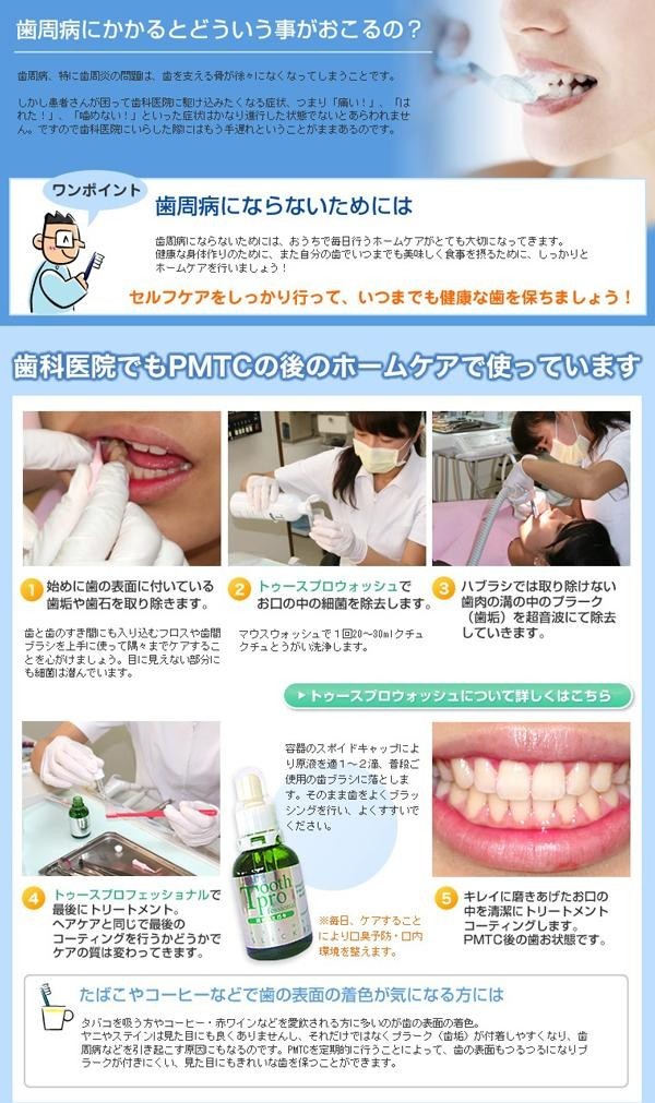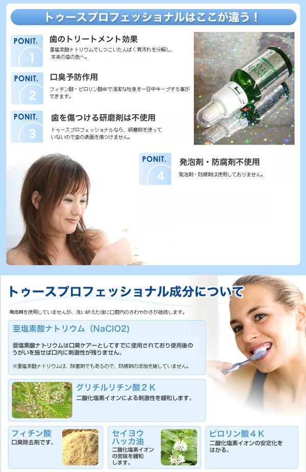 トゥースプロフェッショナルは研磨剤一切不使用なので歯を傷めずに今までの生活習慣で蓄積されたたんぱく質汚れを分解し、歯に負担をかけることなく、本来持っている白さを取り戻します。 |