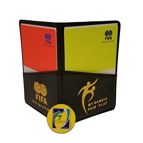 This Leather FIFA Referee Wallet With Cards is made of a very durable synthetic leather and contains yellow and red cards.The wallet fits perfectly inside a jersey or shorts pockets.Bright neon yellow and red colored cards make them highly visible on the field and are very sturdy.The wallet takes standard size score pads on the inside.FIFA Fair Play design. Very high quality wallet, takes standard referee score pads on the inside Fits perfect inside referee's jersey and/or shorts pockets Special wallet design/cut allows referees to take out cards easily and fast Cards are very sturdy and easily visible Wallet size: 3.35 inch x 4.65 inch Cards size: 3.0 inch x 4.2 inch FIFA Fair Play Referee Game Flip Coin, FIFA My Game Is Fair Play Referee Toss-Flip coin.One side is gold-yellow and the other side is dark blue. Coin Comes with protective plastic sleeve Coin diameter: 1.3 inch Wallet Combo Includes: 1x Referee Wallet 1x Yellow Card 1x Red Card 1x Referee Coin with plastic sleeve Game Score Sheets Very professional, and perfect for all referees at all levels! 0