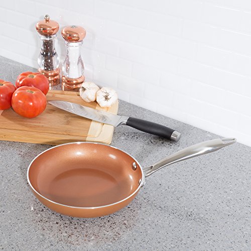 PRODUCT DETAILS - Made of high quality pressed Aluminum with Stainless Steel, double riveted handles. Each pan has 2 layers of Non-Stick Ceramic Coating. Dishwasher Safe but hand wash with non-abrasive cleaner is best and sufficient. Silicone Utensils work best. Avoid using metal utensils that may scratch the non-stick surface. Oven proof up to 500 degrees Fahrenheit. Pan Dimensions - 12 inch Diameter, 2 inch deep, 8 inch handle, 20 inches overall length. Color - Copper