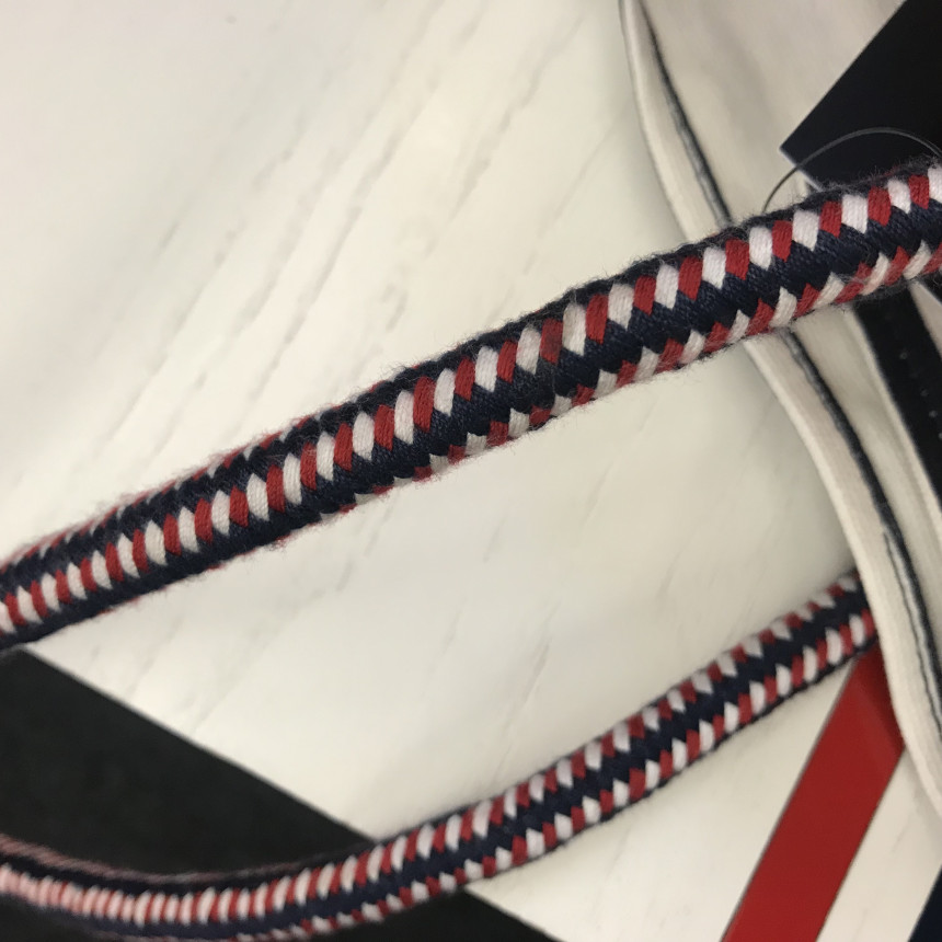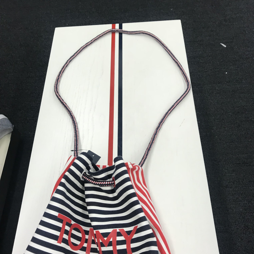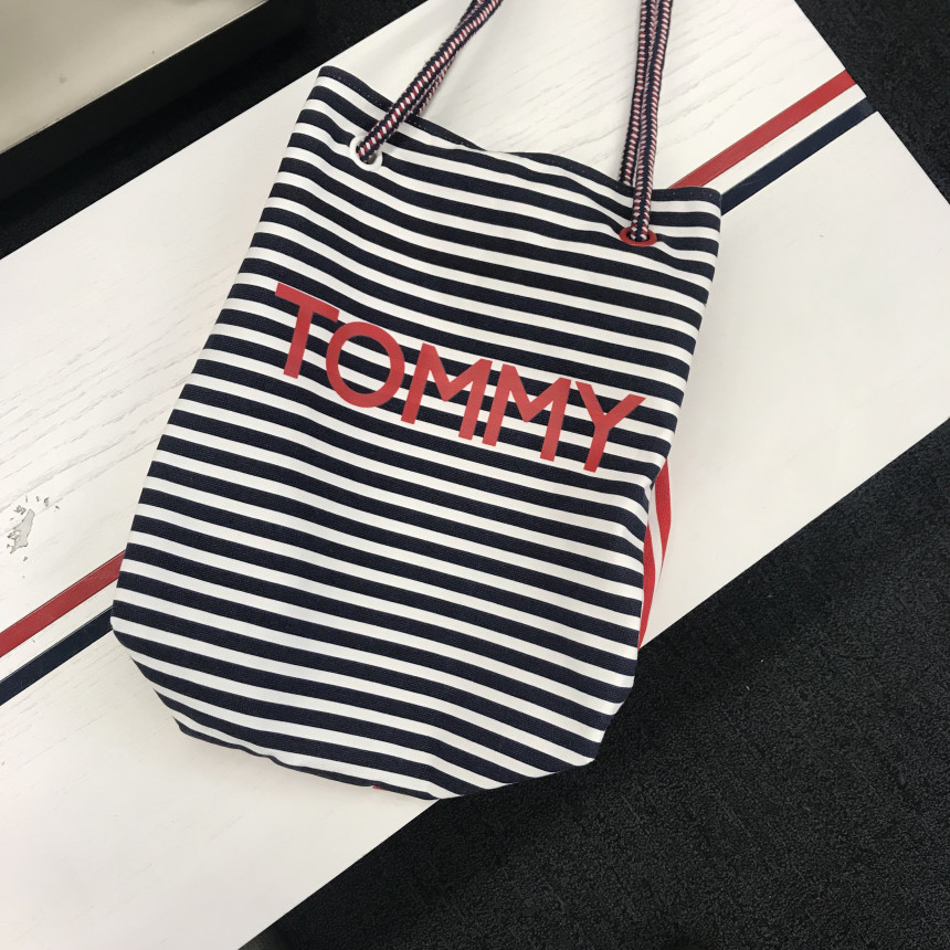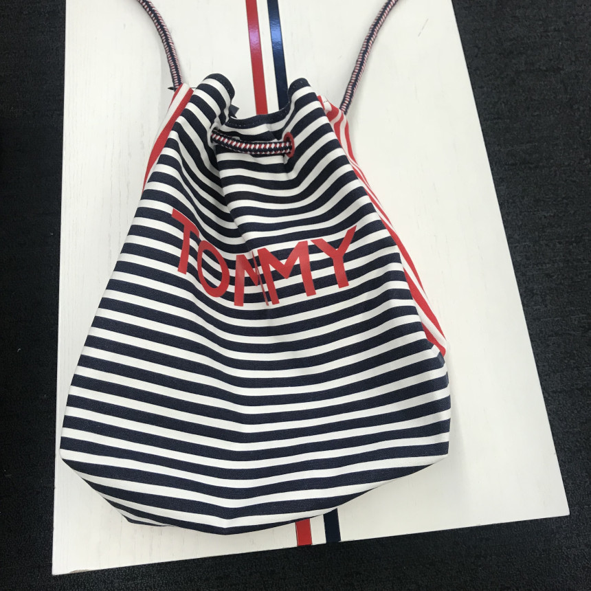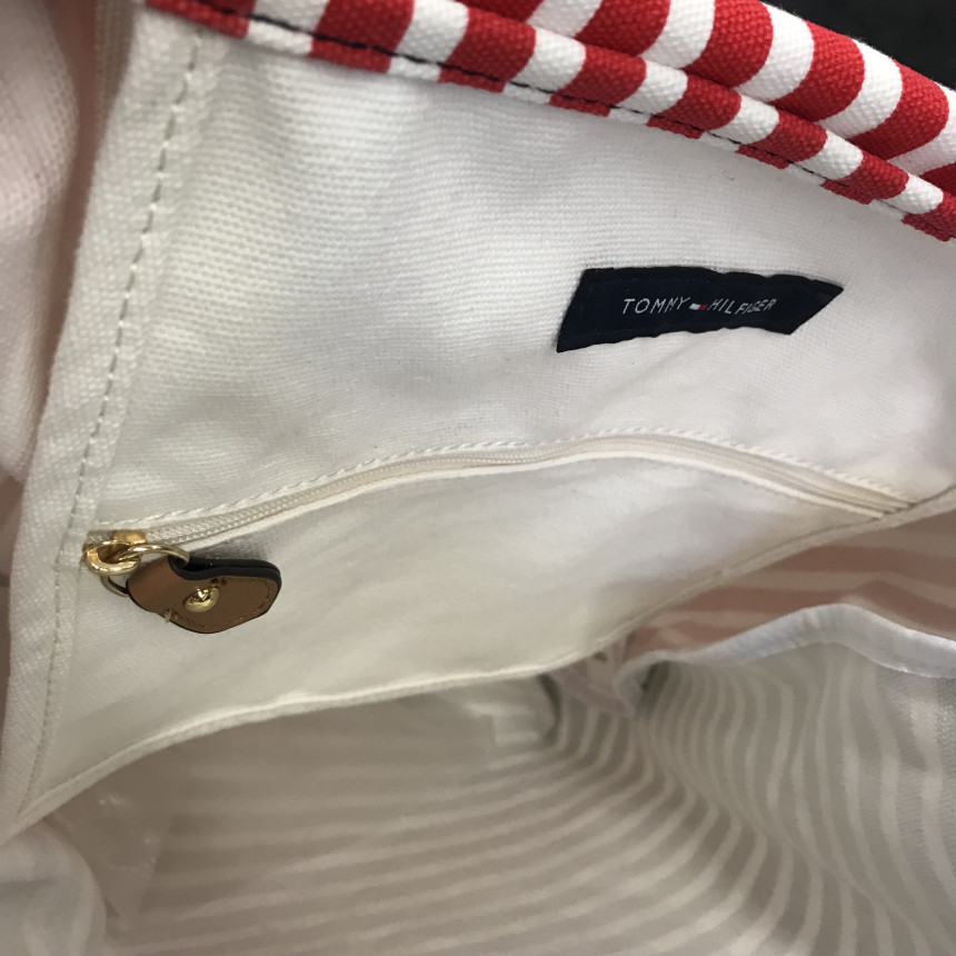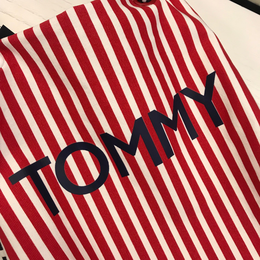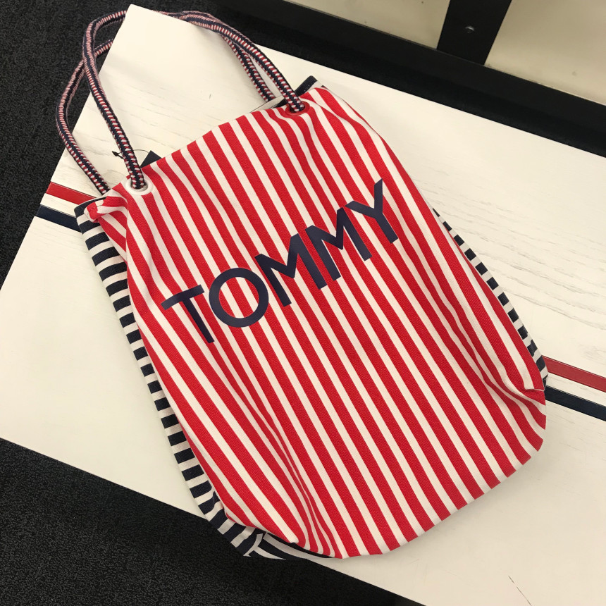 トミーヒルフィガーの信号ティーチャーカラーでストライプパターンが引き立つキャンバスショルダーバッグです。