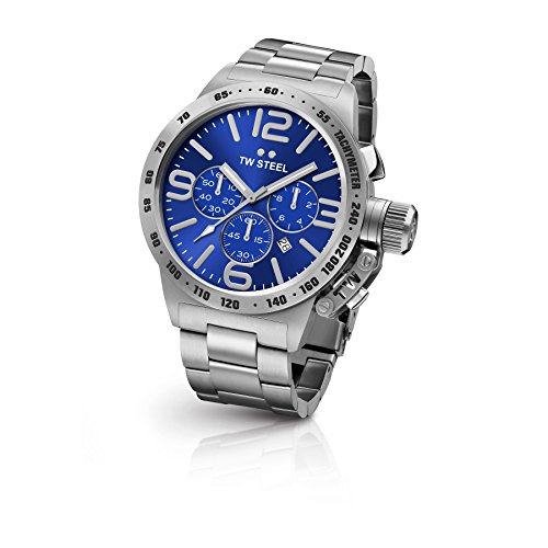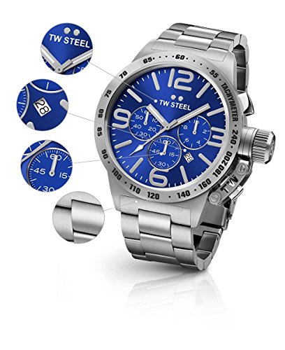 -. Feature : Canteen Style perfectly fuses both classic and contemporary design. This model features a brushed steel case with vibrant sunray blue dial. / Display: Analog, Movement: Chronograph, Crystal: Mineral, Case Material: Stainless steel, Case Color: Silver, Case Diameter: 50mm, Case Thickness: 14mm, Band Width: 24mm, Band Color: Silver, Band Type: Bracelet, Dial Color: Blue, Warranty: Two year, Water Resistance : 100 Meters, Shape: Round, Clasp Type: Buckle. / Movement 6S20 from Miyota, Made of high grade 316L steel, Steel case, Diameter of the case 50 mm, Bezel with tachymeter, Sunray blue dial. / Reinforced mineral crystal with sapphire layer, Crown is covered by a crown cap which is attached to the case with a hook, 10 ATM water resistant, Steel bracelet / TW Steel has been completely devoted to the manufacture and development of big watches. The company's pillars are a distinguished design, combined with reliable technology. Big in oversized watches.