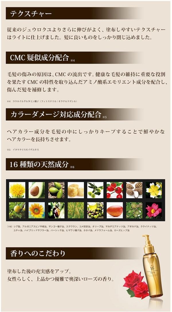 | 16種類の天然由来オイル成分を配合。紫外線やドライヤー、ヘアアイロンなど日常のダメージ要因でパサつきがちな髪にうるおいを与え、伸びが良いテクスチャーで少量でも塗布しやすく仕上げました。ふんわり、サラツヤに仕上がるので、細くコシのない髪の方やヘアオイルが苦手な方にもおすすめです。ドライヤーやコテの熱を味方にする、ヒートアクティブ成分配合のヘアオイルです。 |