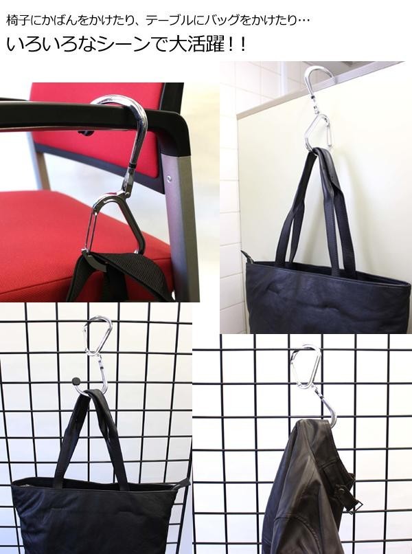 | 重さ22kg(50LBS)に耐えられるカラビナは普段使いはもちろん、アウトドアにも便利!!カラビナから360度回転するフックが出てくるので、バッグをテーブルに掛けたり、ショッピングカートに荷物を掛けたりと色々なシーンで活躍してくれます。デザインもお洒落でバックパック等に無造作に掛けても違和感がありません。 |