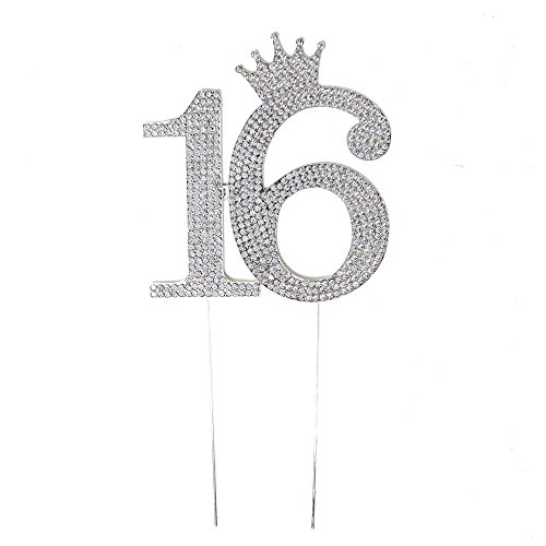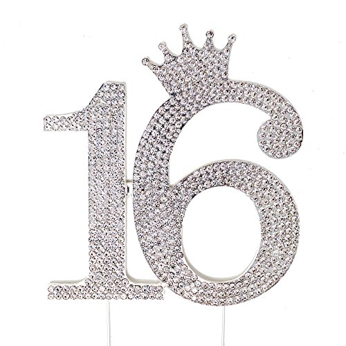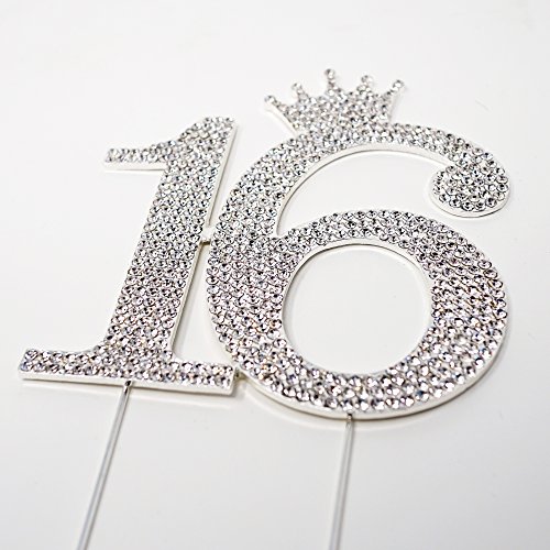 Number 16 Rhinestone Princess Crown Monogram Cake Topper - Sweet 16th Birthday Party (Silver)