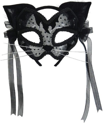 -. Feature : Venetian masquerade cat eye mask / Beautifully decorated with lace detail and ornate trim / Includes side bows with hanging ribbon / Fits to head with the attached head band / Colour: Black/Silver