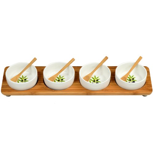 Oblong bamboo tray with four olive motif ceramic bowls and small bamboo serving spoons. Non-slip feet.