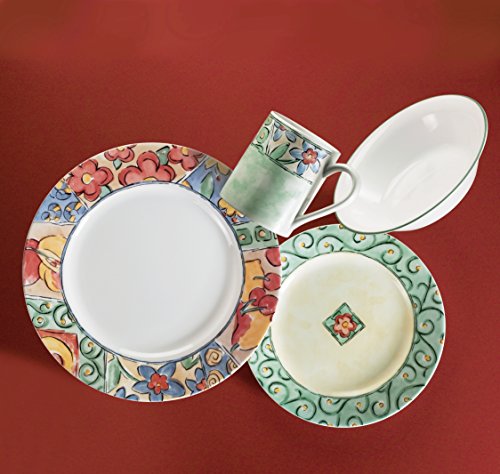 Service for 4 includes: 4 each 10-3/4" Dinner Plates, 8-1/2" Luncheon/Salad Plates, 18-Ounce Soup/Cereal Bowls, 11-Ounce Stoneware Mugs