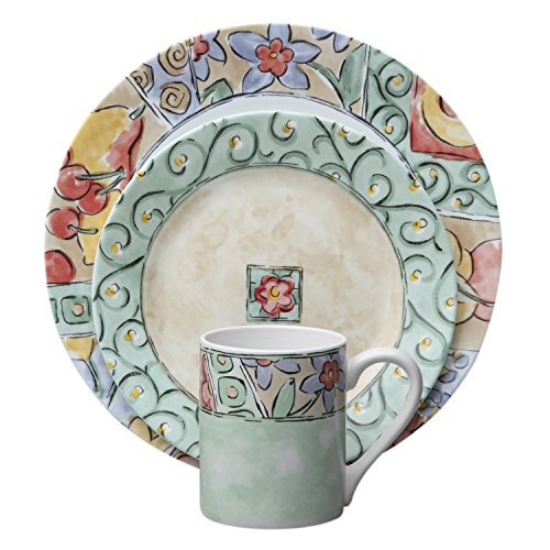 Corelle impressions. The original break and chip resistant glass dinnerware. Trust that it can stand up to the rigors of everyday life and still look great. 3 year replacement warranty against breaking and chipping!This colorful array of flowers and fruit create a watercolor masterpiece to brighten any kitchen. The soft hues of green, beige, gold, blue & apricot blend in perfect harmony to complement many popular styles.Feature