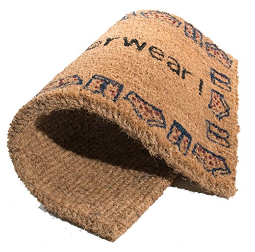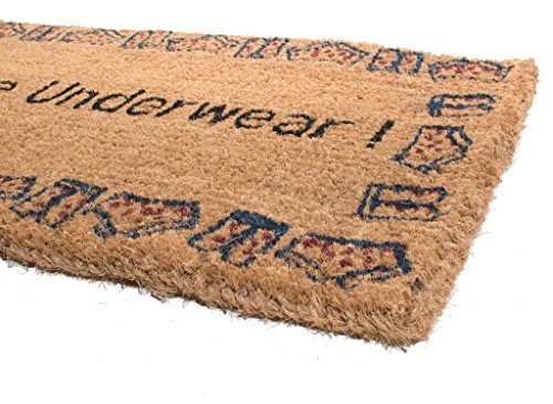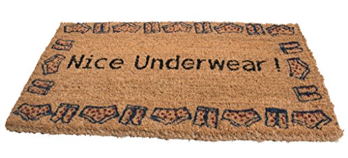 Your guests will do a double-take and get a good laugh when they approach your front entrance and see the words 'nice underwear' printed on the door mat surrounded by a border of underwear. You'll both get a good chuckle when you open the door to greet them. Either way you can't go wrong with a coir door mat from imports decor. Imports decor constructs their doormats with the best quality coir naturally bleached with sea water and stenciled with fade-resistent dyes. Coir is the natural fibre extracted from the husk of coconuts. Coir fibre is relatively waterproof, has superior scrubbing power and is resistent to the elements. with a coir doormat from imports decor, you can feel confident dirt and debris will be left at the front door and not in your home. Item no.321bcmFeature