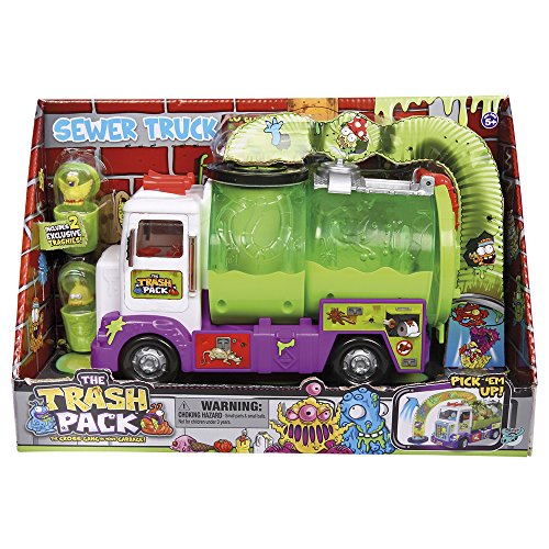 The Trash Pack are a surprise you will love to find in any garbage bin! Collectable Trashies are the grossest monsters in town with over 170 to collect you will have hours of fun with this gross gang and all your friends! Your Trashies are split into 6 uber cool gross gangs The Grubz, Hard Rubbish, Bin-Sect, Bin-Critters, Bin Monsters and Bin Fections plus loads of cool top secret limited editions! Every Trashie has a different rarity - common, rare, ultra rare and limited edition the rarest of the rare even glow in the dark! Pick up the trash germs with the all new Trash Pack Sewer Truck. Suck em up in the vacuum and dump them into the decontaminate chamberÉ release the germs once theyve been sterilised! With a Sewer Truck and two exclusive Trashies in this pack, its the most sick vehicle yet! Suitable for ages 5 and above. Contents: Sewer Truck, 2 exclusive trashies, 2 small bins.Feature