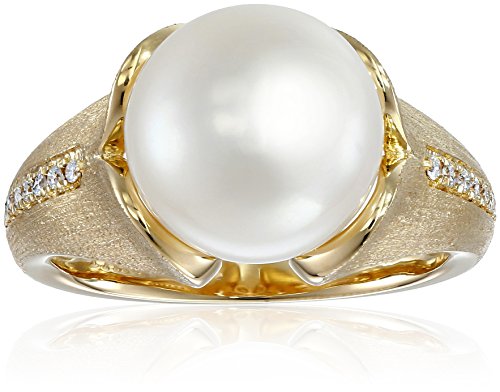 Diamond-encrusted ring in brushed-finish gold featuring high-luster round pearl centerpiece