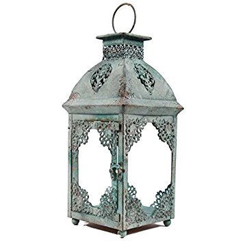 -. Title : Antiqued Distressed Rusty Green Blue Tin Metal Glass Lantern Candle Holder