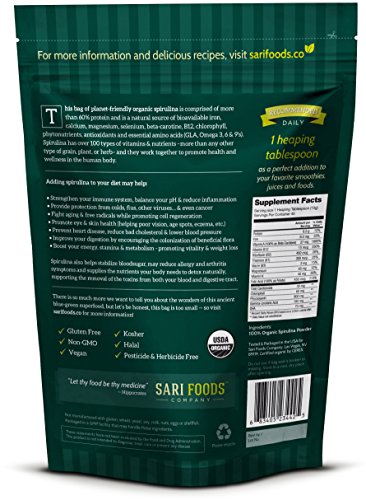 - Feature : OPTIMIZE YOUR HEALTH WITH NATURE'S MOST PERFECT MULTIVITAMIN. With over 100 naturally occurring and bioavailable vitamins & nutrients, Sari Foods Spirulina contains more than 60% protein and is a non-synthetic source of iron, calcium, magnesium, selenium, beta-carotine, B12, chlorophyll, phytonutrients, antioxidants and essential amino acids (GLA, Omega 3, 6 & 9s). / STRENGTHEN YOUR IMMUNE SYSTEM. Organic Spirulina is the most nutrient dense food known to humankind and works miracles in the body by helping to balance your pH and reduce Inflammation - which is the root of most disease. This nutritional content is immuno-amazing! / FIGHT AGING & FREE RADICALS. This miracle from the sea has more antioxidant activity than 5 servings of fruits and vegetables and 3900% more beta carotene than carrots, packing a powerful antioxidant punch that promotes skin health and cell regeneration while providing protection from cell-damaging molecules absorbed by the body through pollution, poor diet, injury, or stress. / IMPROVE ENERGY, MOOD & METABOLISM. Organic Spirulina elevates your energy by unlocking sugar from your cells so it does not get stored as fat. The deep green color of Spirulina comes from a high concentration of Chlorophyll which absorbs its pure energy from sunlight and is considered nature's most effective energy booster, giving you instant and all-day energy.