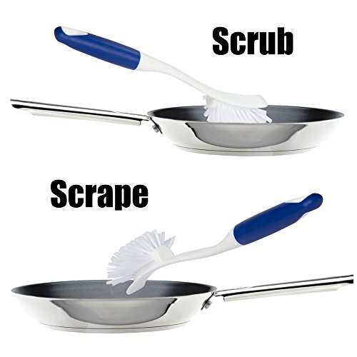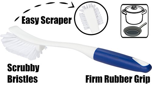 EASY GRIP POTS AND PANS SCRUBBER/SCRAPER HITS cookware with a one-two punch. Stiff and durable nylon bristles scrub cooking residue away while the flat scraper side makes hardened stains and grime build up disapear.