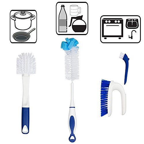 Kitchen Cleaning Tools Set - 4 Brushes Total - Bottle Brush - Pots and Pans Scrub and Scraper - 2 in 1 Sink and Surface Scrub Brush With Mini Detail Brush
