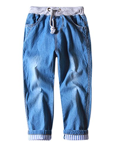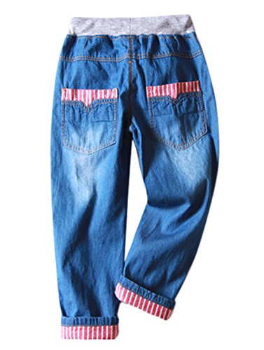 -. Feature : Material: Denim and Cotton Blend, comfortable soft and breathable, friendly to kids' skin NOTICE: Please check SIZE CHART detail in our description carefully before purchasing, not only choose base on AGE , chooser 1 size larger will be better / Wide Ribbed Knit Waistband?jean bot with wide waistband with adjustable rope is perfect for growing kids / Fashion Rolled Cuffs Design: bright colorful stripes patterns cuffs denim trousers, two back pockets and two front pockets / Washing Instruction: machine wash or hand wash(better) in cold water, do not bleach, iron, or put in high temperature water / All-Match Jeans: suitable in SP.R.Ing, Summer and Autumn as daily life wearing in multi accasions, best gift for boys and girls.
