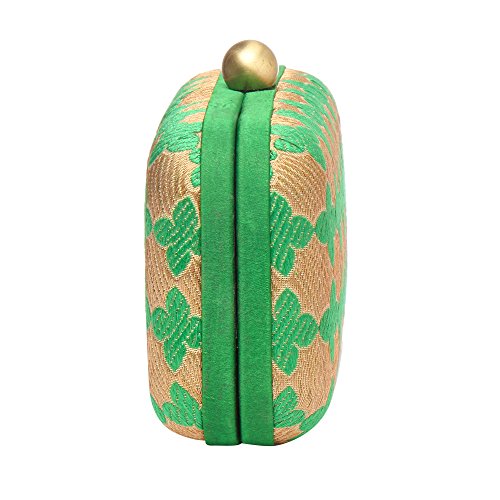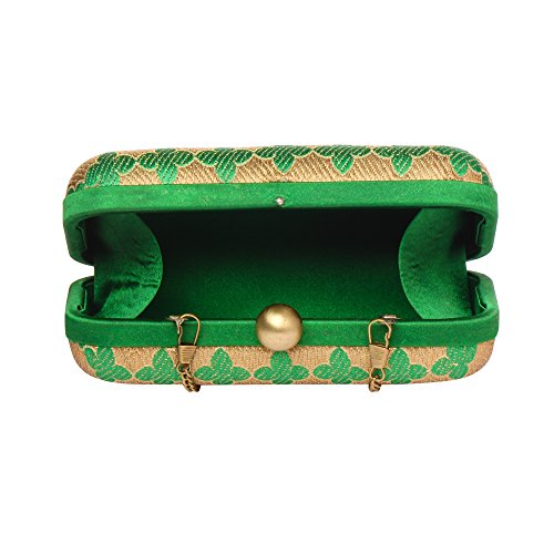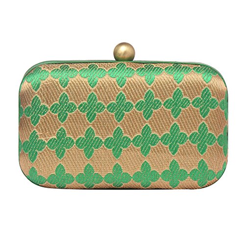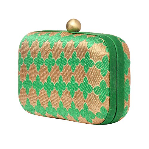 Product Description Monokrome New York is an Indian brand offering versatile bags for all occasions and age groups. Our team in New York works diligently to get you the fashion straight from the runways. All our products are value added/ handcrafted, exclusive, with Indian workmanship and global appeal. We are adorned with the people who value individuality, collectability and quality and the people constantly inspire us to create a new shift in the essence of runway trends. We are fashion We are special We are abreast We are made in India MONOKROME NEW YORK Jackson stylish Evening Hard case brocade/silk jacquard ethnic party green and gold clutch handbag with rich satin tonal lining handcrafted in India for women. Exterior--Clutch exterior is made of woven silk brocade jacquard in gree and gold colour. Metal frame has been specifically covered in a tonal satin fabric to give it a value-added and chic appeal. Interior-Interior has been neatly finished with rich satin luxe lining. It has a Monokrome branded label inside. The volume is sufficient enough to carry a mobile phone/credit cards, some liquid currency, and makeup. Detachable metal chain strap- 55 cm long. Size- L X W X H -6 X 2 X 4 Inches / 16 X 5 X 10 cm MATERIALS Silk jacquard crafted Brocade- The front is covered with poly/silk/lurex blended jacquard. Strong and durable but not stain resistant. Keep the clutch stored in a dust bag. DETAILS Size/Capacity- ergonomically designed easy to be clutched by your hand. Enough volume to carry an I phone/ credit cards, some liquid currency and some makeup. Superior hardware frame which is made from superior Zamak alloy and is durable and strong. It is electroplated to resist rust, corrosion, and tarnishing. Safety- Clasp closure mechanism make sure that your valuables are secure. 0