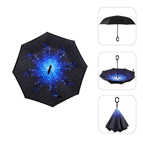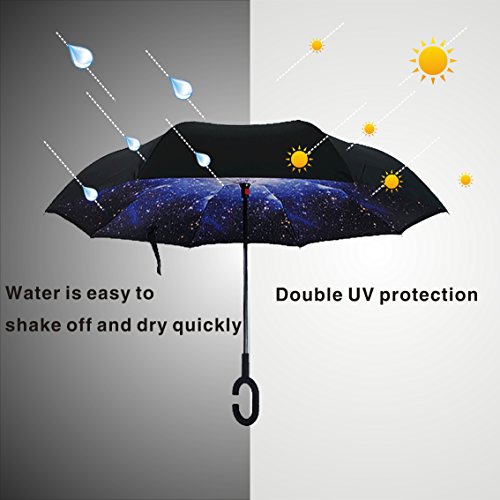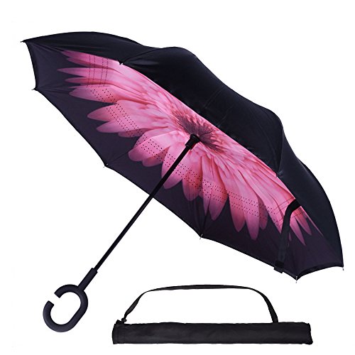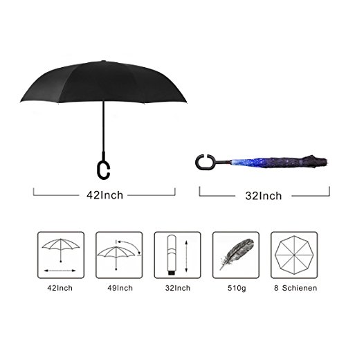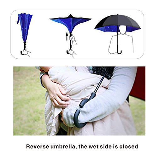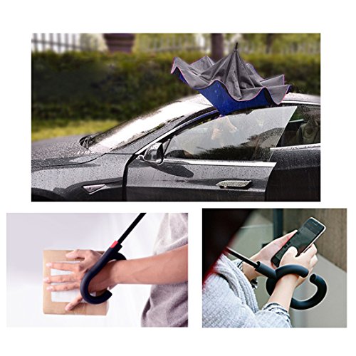 1.New reverse design Hold the red button and you can take the umbrella down The wet side of the umbrella will be stored inside to keep the room dry 2.Umbrella reinforcement Umbrella petal pattern is both practical and beautiful 3.Matte C-type handle the hand can be put into the C-type handle, the liberation of your hands, playing mobile phones, holding children, carry heavy