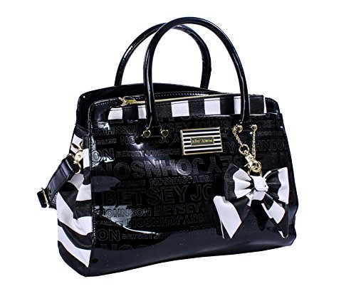 Betsey Johnson Monogram Faux Leather 3 entry bag in a bag satchel shoulder bag with center zipper divider & dangling bow charm. Dual rolled handles with removable shoulder strap with stripe zippered pouch & stripe side. Metal Betsey Johnson monogram plate. Fully lined interior with back zip wall pocket plus 2 slip pockets. Dimensions: L X 13 X D X 4 X H X 10" Dual handle drop: 4" Removable Shoulder strap drop: 23"Feature