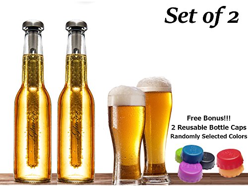 -. Feature : CHILL BEER OR SODA POP INSTANTLY: Set contains two (2) BPA-Free FDA approved in-bottle beer/soda pop chillers that quickly cool drinks from inside the bottle and keeps them cold to the last sip. / FREE BONUS REUSABLE BOTTLE CAPS: Preserve your unfinished drinks with these reusable bottle caps. This set comes with 2 caps as a FREE BONUS with your purchase! / PERFECT UNIQUE GIFT: Ideal for the beer lover in your life, or anyone who would enjoy a cold drink. Great gift for men and women; especially dads, husbands, uncles, brothers and friends. / EASY TO USE, CLEAN AND STORE: Hand wash. Slim design allows for convenient storage when not in use. / 100% MONEY BACK GUARANTEE: If you don't love this product simply return for a full refund.