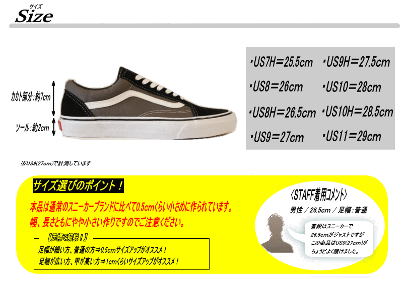 | サイズ | 作り⇒やや小さめ 【サイズ選びのポイント!】 足幅が細い方、普通の方⇒0.5cmくらいサイズアップがオススメ! 足幅が広い方、甲が高い方⇒1.0cmくらいサイズアップがオススメ! |