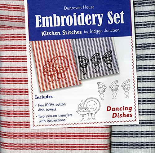- Dunroven house-dancing dishes kitchen stitches embroidery set: cream with red & cream with green stripes