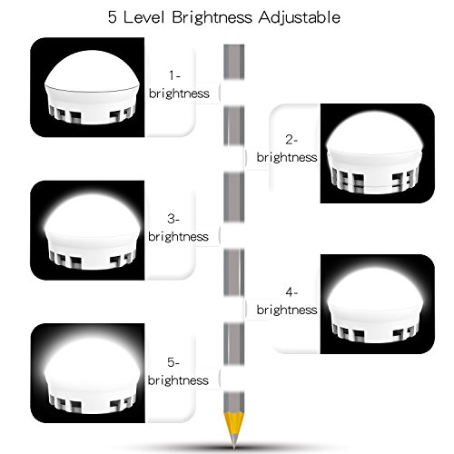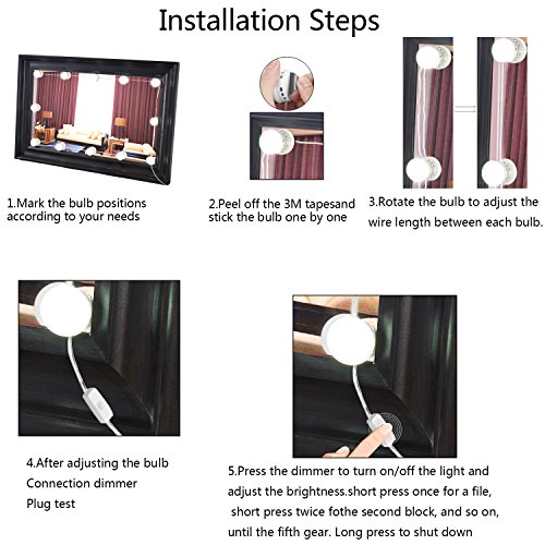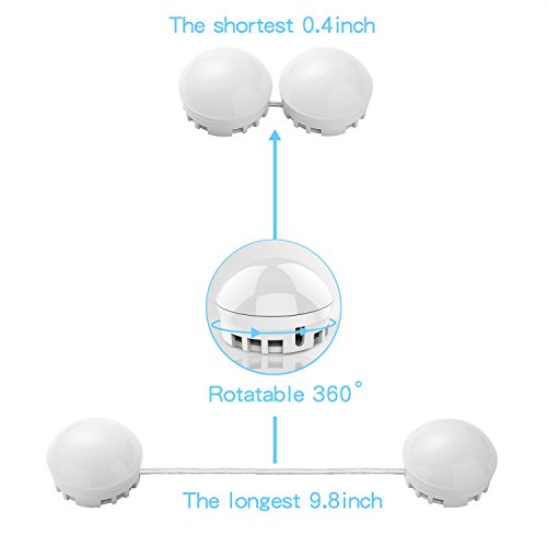 - 【Adjustable Brightness And wires Length】 5 Level brightness adjustable, you can adjust the brightness with the dimmer switch to dimmed the light for your need.And,you can adjust the string length by rotating the bulb between each bulb to match your mirror size.(Note:First bulb is to Connect the power,so it’s can’t rotating )