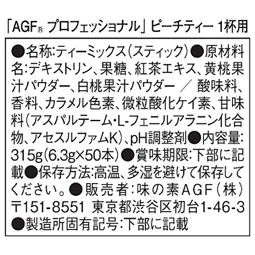 原材料:デキストリン、果糖、紅茶エキス、黄桃果汁パウダー、白桃果汁パウダー、酸味料、香料、カラメル色素、微粒酸化ケイ素、甘味料(アスパルテーム・L-フェニルアラニン化合物、アセスルファムK)