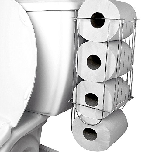 - Toilet paper holder dispenses rolls from bottom. Holds up to 4 standard sized rolls of toilet paper.