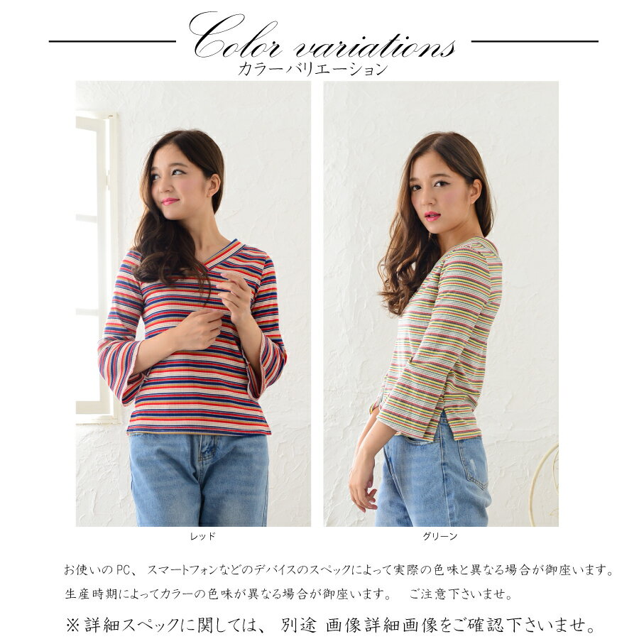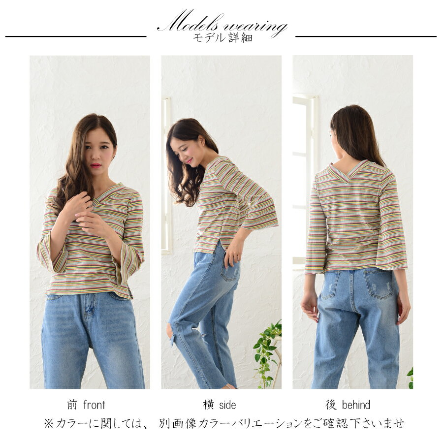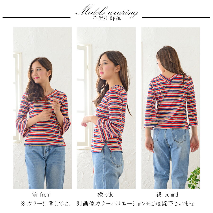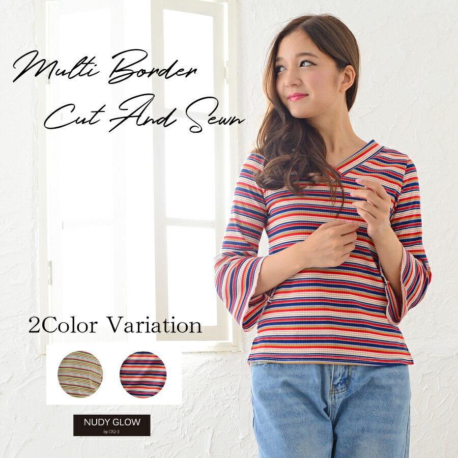 春夏に引き続きトレンドのマルチボーダーでラッパ袖が特徴のカットソー素材のトップスです。