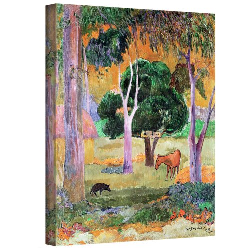 Paul Gauguin 'Dominican Landscape' gallery-wrapped canvas is a high-quality canvas print that uses simplified images and bold colors to capture a rural, tropical landscape. It is the intersection of country charm and post-impressionism. Eugene Henri Paul Gauguin was raised in Peru, the son of a French journalist and a Peruvian Creole. He became a leading French Post-Impressionist artist. Gauguin was recognized for his experimental use of colors and synthetics style that were notably different from Impressionism.Feature