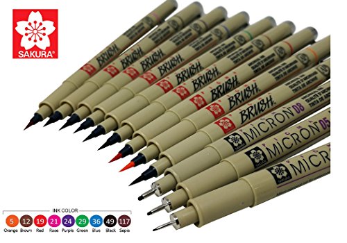 - Pigma Micron Creative 12 piece set with pen case : 9 colors (Brush flexible) with Black (01 - 0.25mm, 05 - 0.45mm, 08 - 0.50mm)