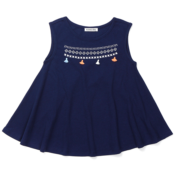 블루독 에스닉 민소매 티셔츠는 앞판에 에스닉한 패턴의 그래픽이 포인트이며 컬러 태슬로 여성스러움을 강조 하였고