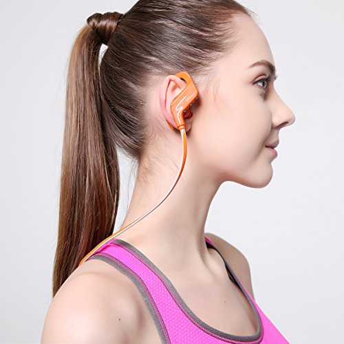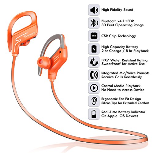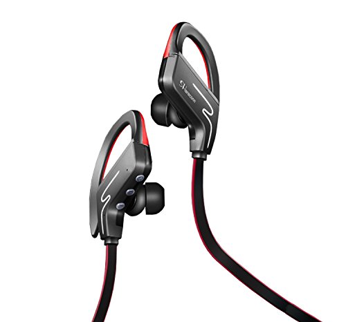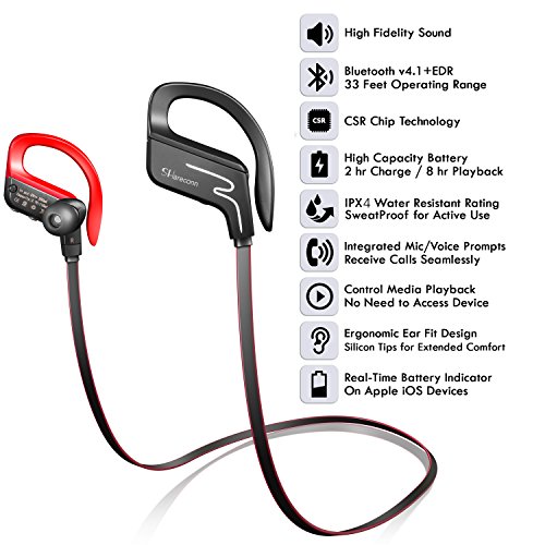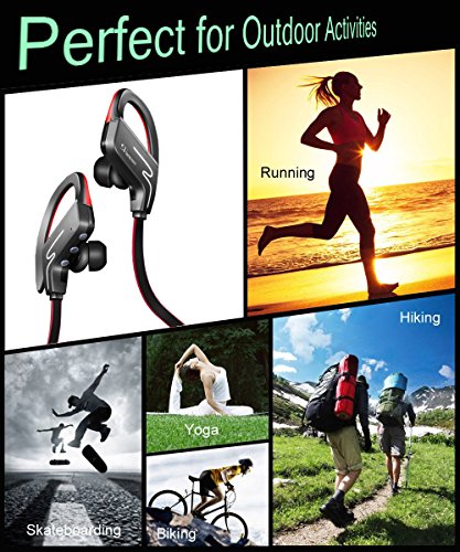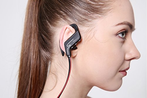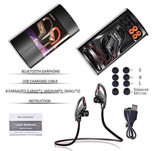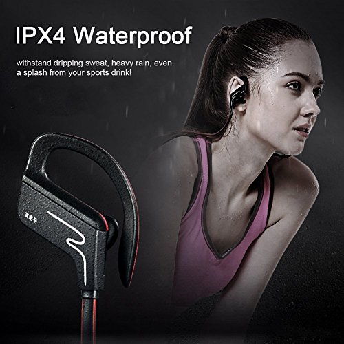 -. Feature : Over-the-Ear Hooks with ergonomical design, unique design of scattered strength helps to divert pressure from the bridge of the ear,stay put and don't come loose,comfortable for wearing. / 4 sets different sizes of earbuds ensure the snug fit for different sizes of ears and different tonal quality.Built-in NFC technology for simple and fast connection or disconnection / POWERFUL BATTERY Up to 8 hours Music playing on a full battery charge. Super quick charge time of only 2 hours which lasts up to 180 hours of standby time. A 15 minute supercharge gives over 1 hour of playback time. Much more than other sports headphones! / SUPERB HD SOUND Advanced Bluetooth V4.1+CSR technology delivers astonishing acoustics. Experience realistic stereo digital quality sound on the go, enjoy natural sound and beats with the deep base you crave with the freedom that this wireless headphone offers with Up to 30ft Bluetooth range. Super quick pairing with all android, Apple and all Bluetooth enabled devices. / Great bass a and treble,Superb microphone quality for clear conversations. Easy to use buttons for full audio control without reaching for your phone.CVC 6.0 Digital noise reduction technology, intelligently filter ambient noise, enable clearer sound during calls and while listening to music